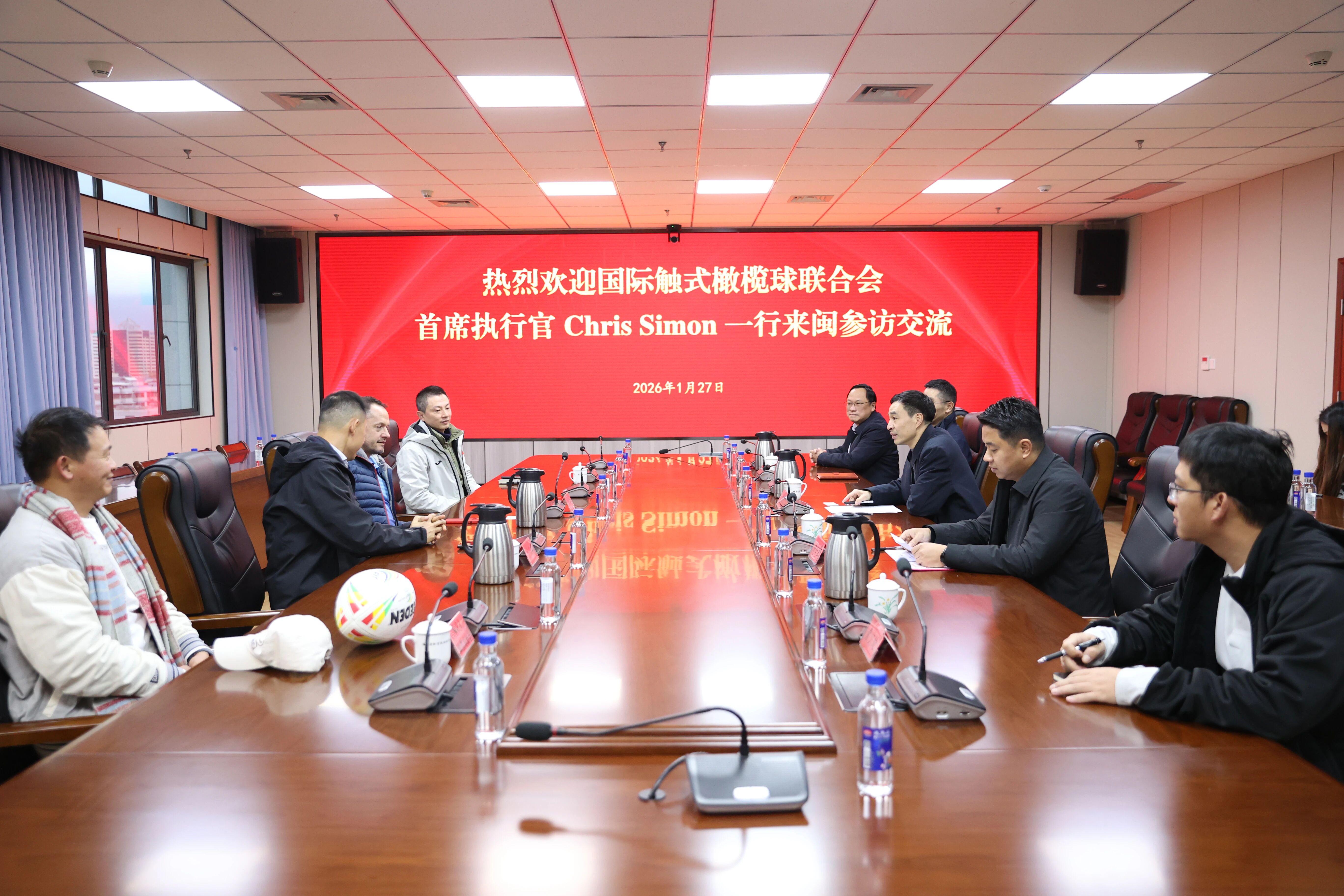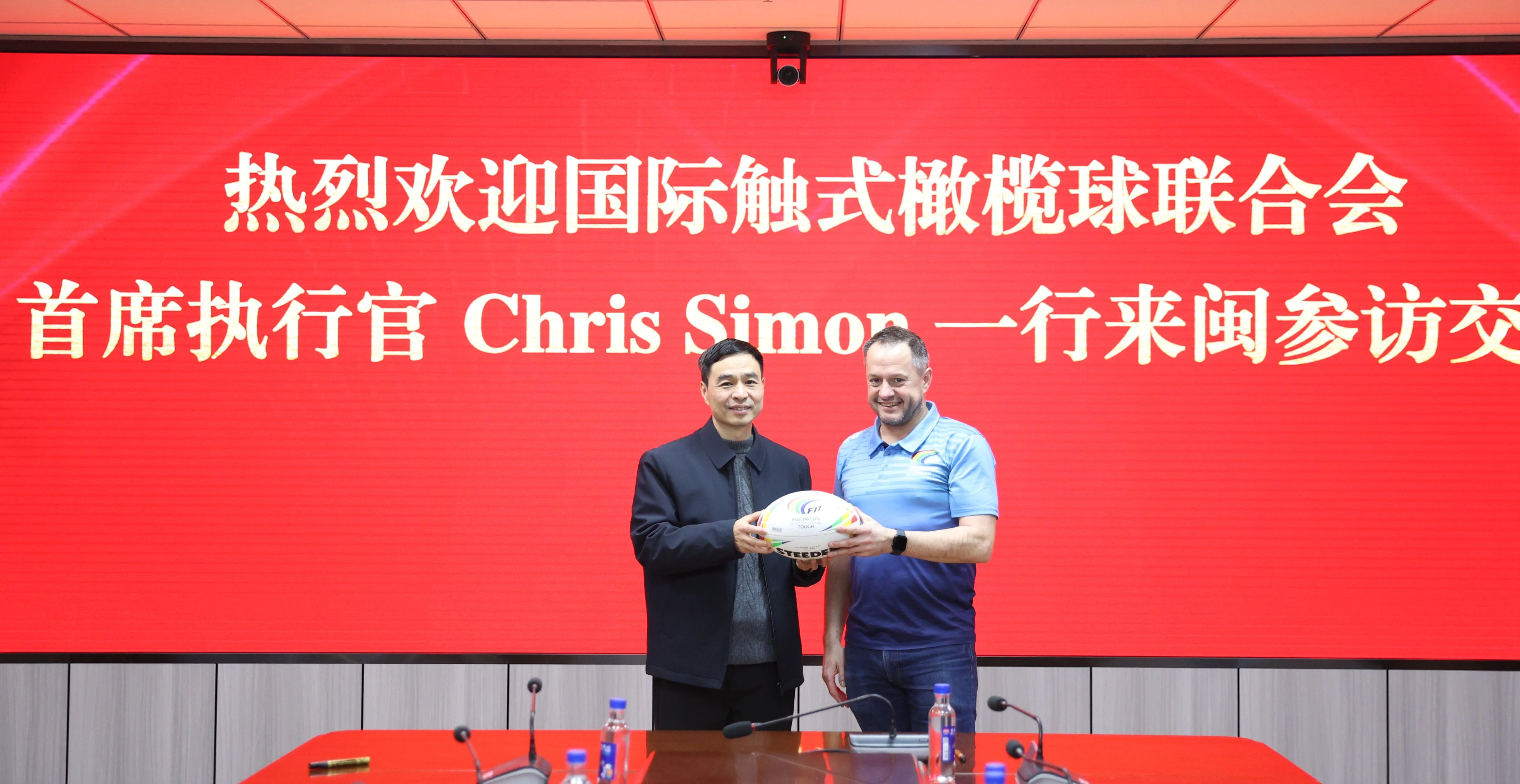 1月27日,国际触式橄榄球联合会首席执行官 Chris Simon 一行来闽参访交流。三亿体育有限公司党组书记、局长叶得盛会见代表团一行,双方围绕触式橄榄球国际交流与未来合作前景展开深入交流。